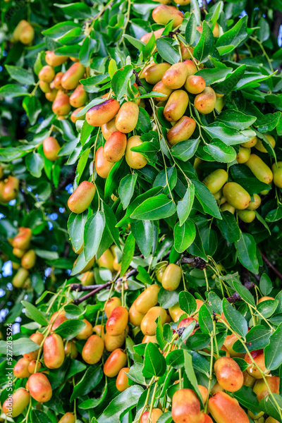 Sweet jujubes grow on jujube tree. Ripe date fruits in autumn season.