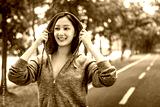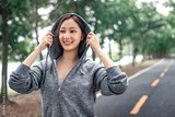 Happy young asian woman smiling before workout sport exercises outdoors on a background of park trees. Healthy lifestyle well being wellness happiness concept