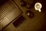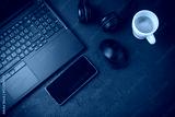 Office table with notebook, computer keyboard, mouse, headphones, tablet pc and smartphone