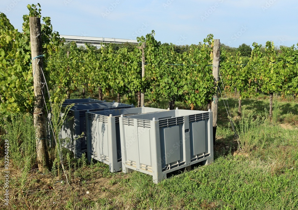 Large plastic bulk bins used for harvesting, transporting or storage of fruit lined up outside the vineyards waiting to be filled of grapes.