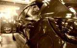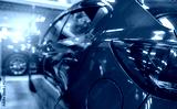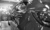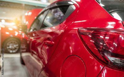Rear view of red SUV car parked in car repair shop. Red car in workshop of service station. Vehicle inside garage workshop. Cleseup tailight. Red car in garage for repair and maintenance service.