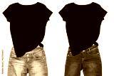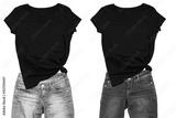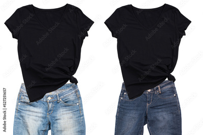 Summer Female black t shirt, jeans set mock up flat lay isolated on white background. Top front view t-shirt collage and copy space. Mockup t-shirt and summertime. Template blank shirt.