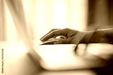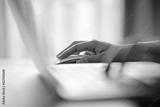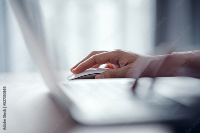 Close up finger of woman using modern white wireless mouse while working on laptop computer on wooden table at home.
