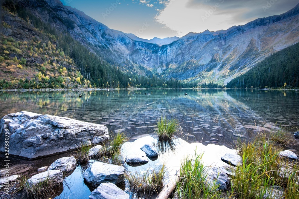 Avalanche lake shore in Glacier National Park with mountains reflected on the water surface