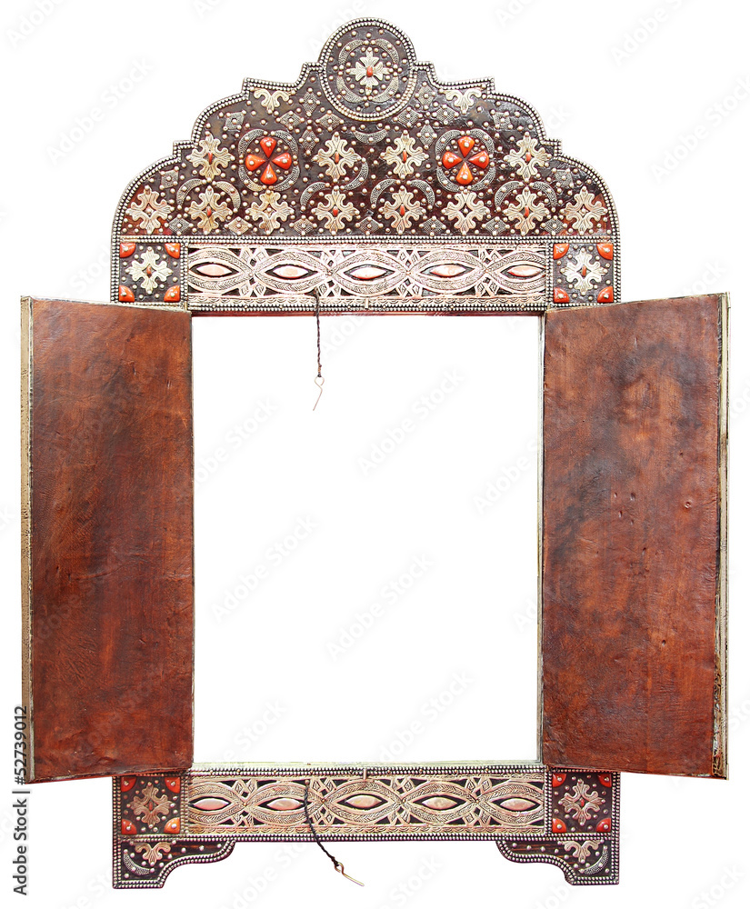 Antique Moroccan mirror frame made of silver and leather, isolated on white background