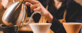 hipster barista pouring a hot water to making coffee with drip or filter style in cafe, slow brew for caffeine aroma beverage drink in cup, fresh black coffee and espresso for breakfast