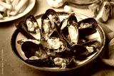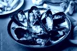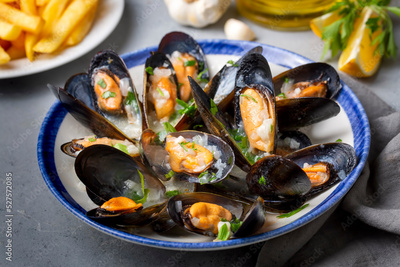 Delicious seafood mussels with parsley sauce and lemon. Delicious steamed mussels.