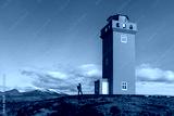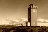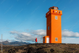 A tourist girl in a red jacket looks at the Svortuloft Lighthouse in Snaefellsnes National Park, Iceland.