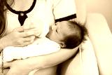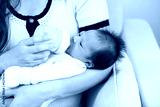 Close up hand of mother holding milk bottle Newborn baby lying on bed drinking milk at warmth place. Cute infant baby feeding milk good moment with love at home .Newborn Baby Concept