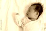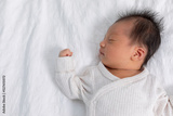 Top view happy newborn baby lying sleeps on a white blanket comfortable and safety at warmth place. Cute Asian newborn sleeping and napping on bed. Newborn Baby Care concept