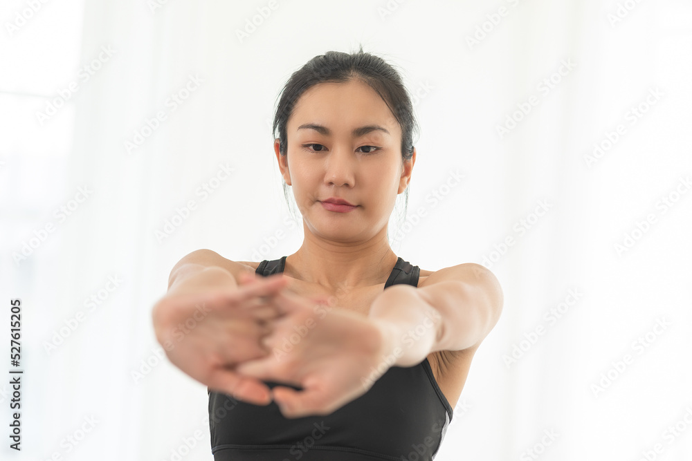 Calm of Asian woman in sportwear stretching muslce to warm up breathing and meditation with yoga at home. Healthy female stretching muscle comfortable and relax before exercise ready to workout