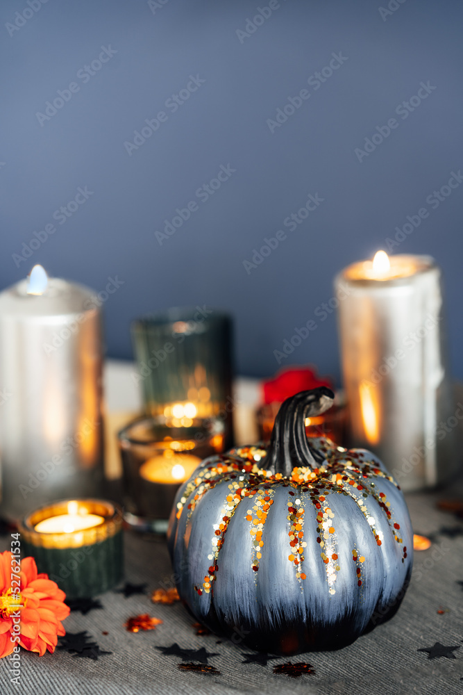 Autumn cozy mood composition for home decoration. Gray pumpkin with sequins, burning candles, fresh dahlia flowers on tray with napkin. Fall, hygge home decor. Vertical. Selective focus. Copy space.
