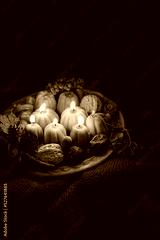 Burning pumpkin shape candles, acorns and nuts in plate on dark abstract background. autumn seasonal composition. symbol of harvest, Mabon, thanksgiving, Halloween. fall time. witch magic ritual