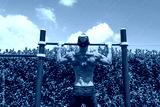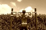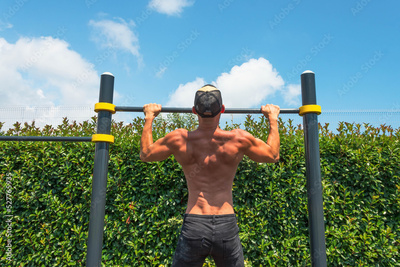 Muscular man in a cap doing pull-ups on the horizontal bar in the park outdoors, back view of his back.