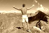 Tanned man with a naked torso in shorts with his arms raised on a mountain top in summer among alpine meadows a tourist on a rock. Travel concept, mountain lovers.