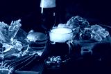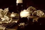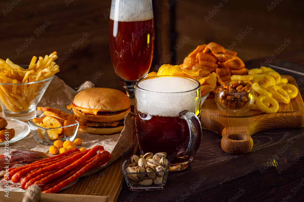 Glass of beer on bar counter. Jugs, mugs, pints of brew beverage, ale, cider on wooden table in pub, bar. Backlit dark showcase with craft beer bottles in brewery. French fries fried potatoes snack