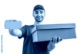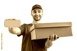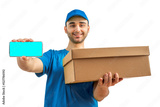 Delivery man with a box, smartphone. Courier in uniform cap and t-shirt service fast delivering orders. Young guy holding a cardboard package. Character on isolated white background for mockup
