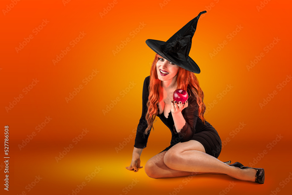 Witch on Halloween. Female wizard fairy character for All Saints' Day. Fantasy gothic red-haired Vampire girl in black dress. Enchantress dressed in carnival costume