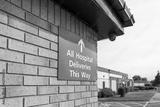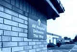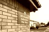 Shallow focus of a large Hospital Delivery sign directing all medical deliveries to the side entrance of this sprawling hospital.