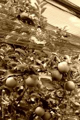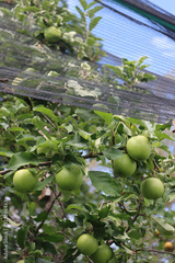 Close-up of green Granny Smith apples growing on branch on tree. Malus domestica