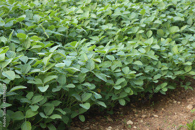 Green soybean field on late summer. Glycine max