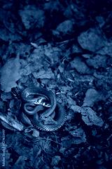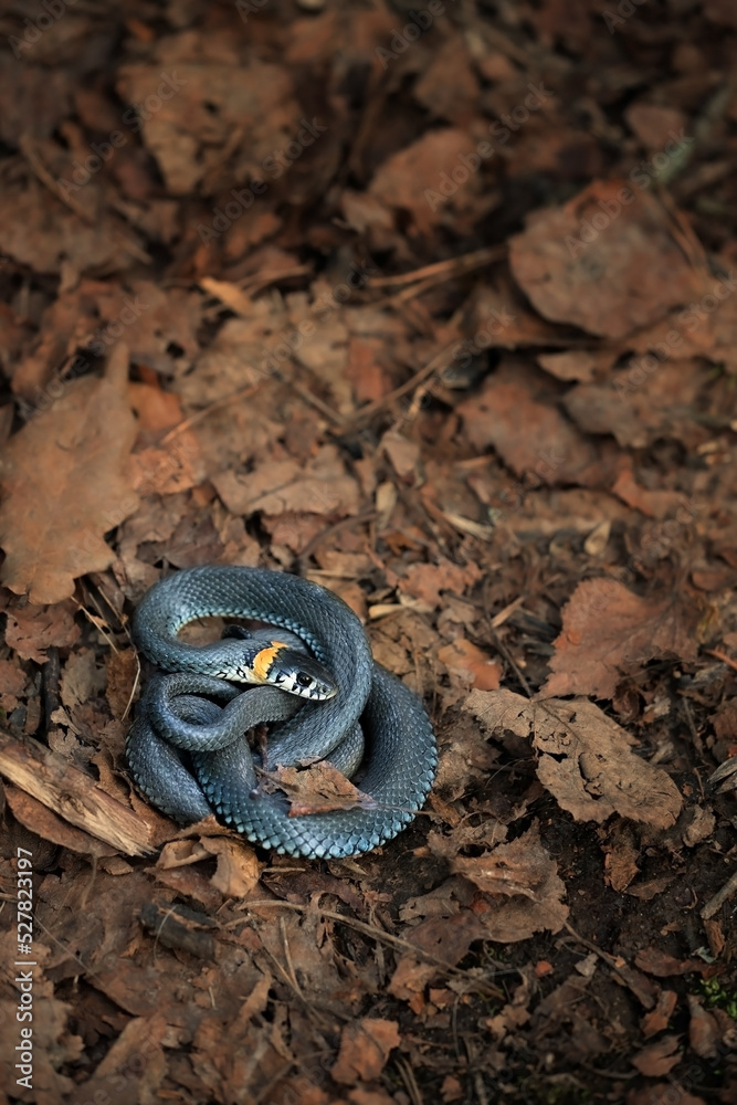 Grass snake or water snake lying on autumn dry leaves close up, abstract natural background. portrait of Eurasian non-venomous snake (Natrix natrix). wild reptiles, save ecology animals life concept