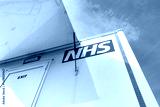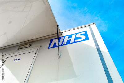 Abstract view of a British health service logo seen on a mobile cancer screening unit trailer. Patients exit this door once the screening has taken place.