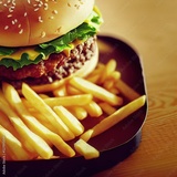 Hamburger and fries on a tray. Fast food. Fresh cheeseburger with french fries on a wooden table.