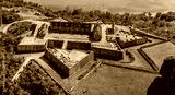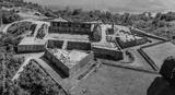 Close up aerial view of Fort Ticonderoga on Lake George in upstate New York from the revolutionary war era with four bastions, demi lune, ravelin, covered way and glacis
