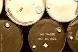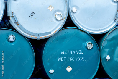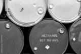 Old chemical barrels. Stack of blue methanol or methyl alcohol drum. Steel chemical tank. Toxic waste. Chemical barrel with toxic warning symbol. Industrial waste in drum. Hazard waste storage.