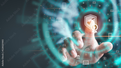Approved cybersecurity and login authentication With AI database technology, business people use fingerprints to unlock the system and provide access, connection, security and online privacy.