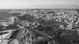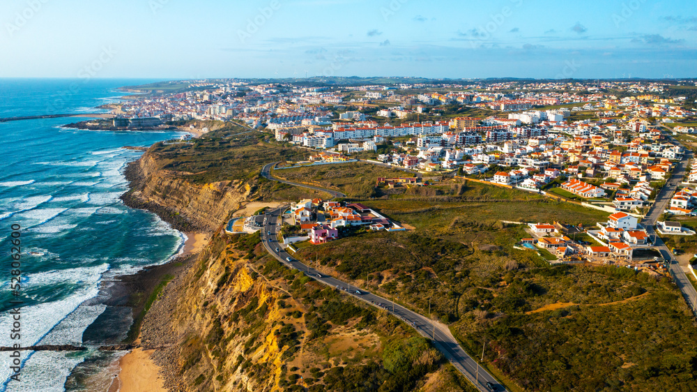Drone aerial view over beaches, coastlines in Ericeira, Portugal, on summer sunny day. Aerial view to the Beautiful European touristic town. Beautiful cityscape with skyline, ocean rocky shore. Travel