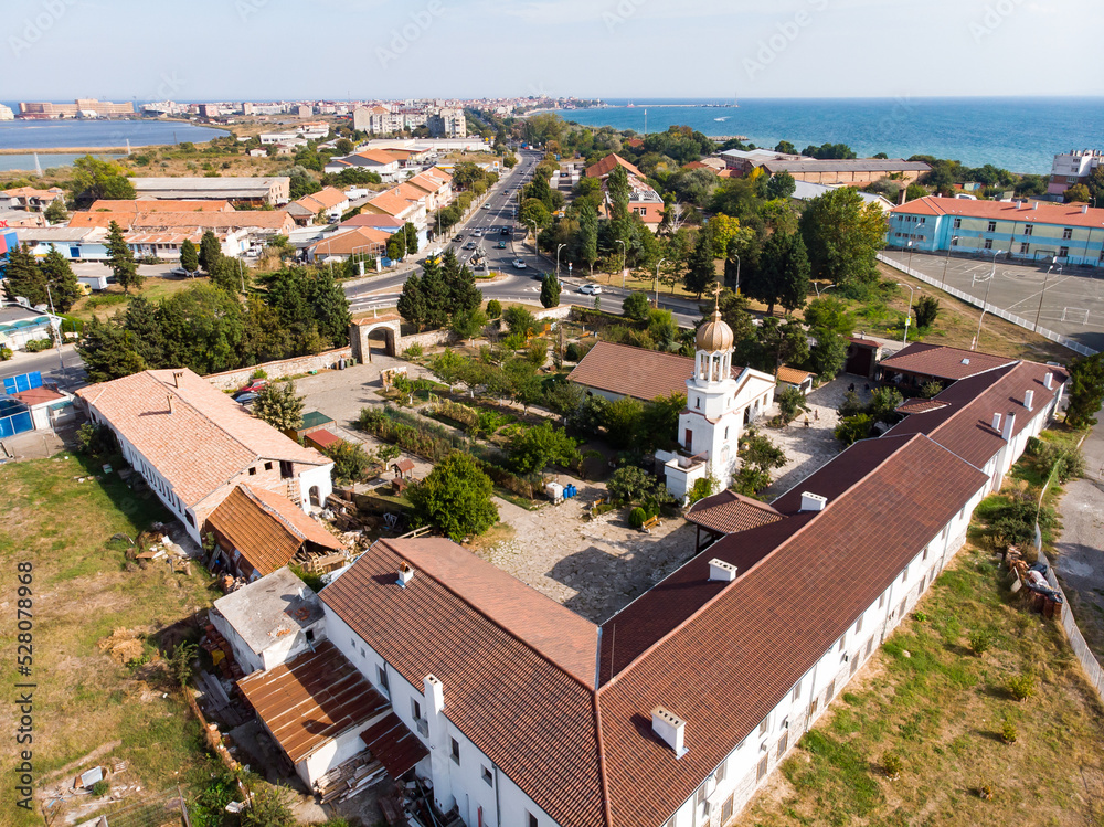 Sea cost and beaches in Sveti Vlas in Bulgaria. Aerial photography, drone view. Summer holidays in Europe during quarantine.