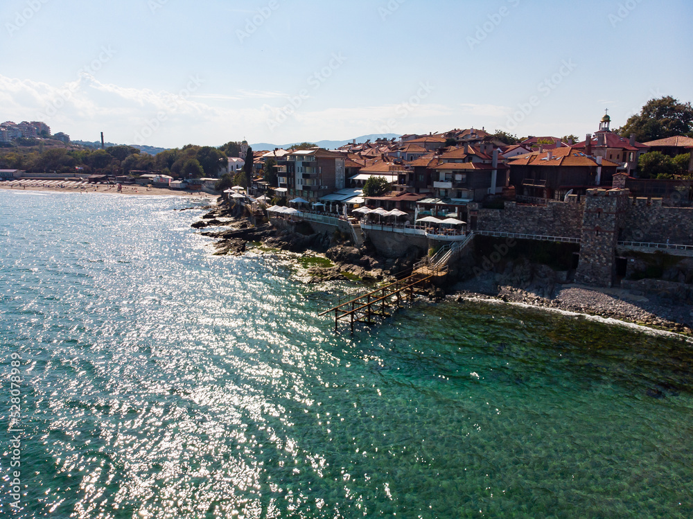 Sozopol, Bulgaria - Aerial view of medieval city and Black Sea. Drone view from above. Summer holidays destination