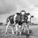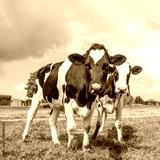 Two cows approaching and oncoming in a field, shaky and curious standing in a pasture under a overcast sky and a horizon over land
