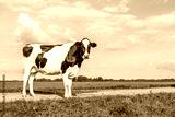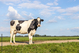 Sassy cow full length on a path in a field, black and white milk cattle standing happy, a blue sky and horizon over land