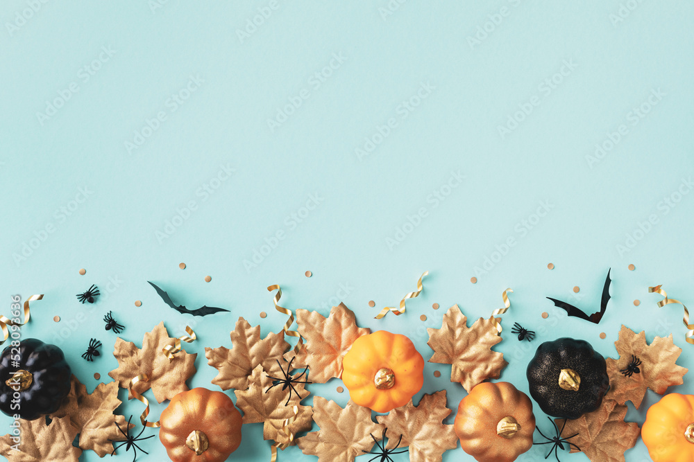 Halloween holiday border with party decorations of pumpkins, bats, spiders on blue background top view. Happy halloween card.