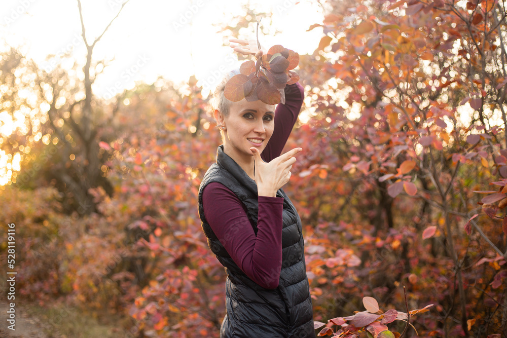hipster happy woman with short hair in autumn forest background with golden and red trees