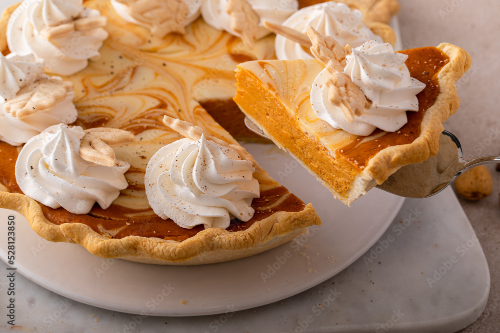 Pumpkin cheesecake swirl pie topped with whipped cream