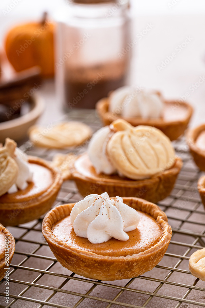 Mini pumpkin pies with wipped cream and cinnamon