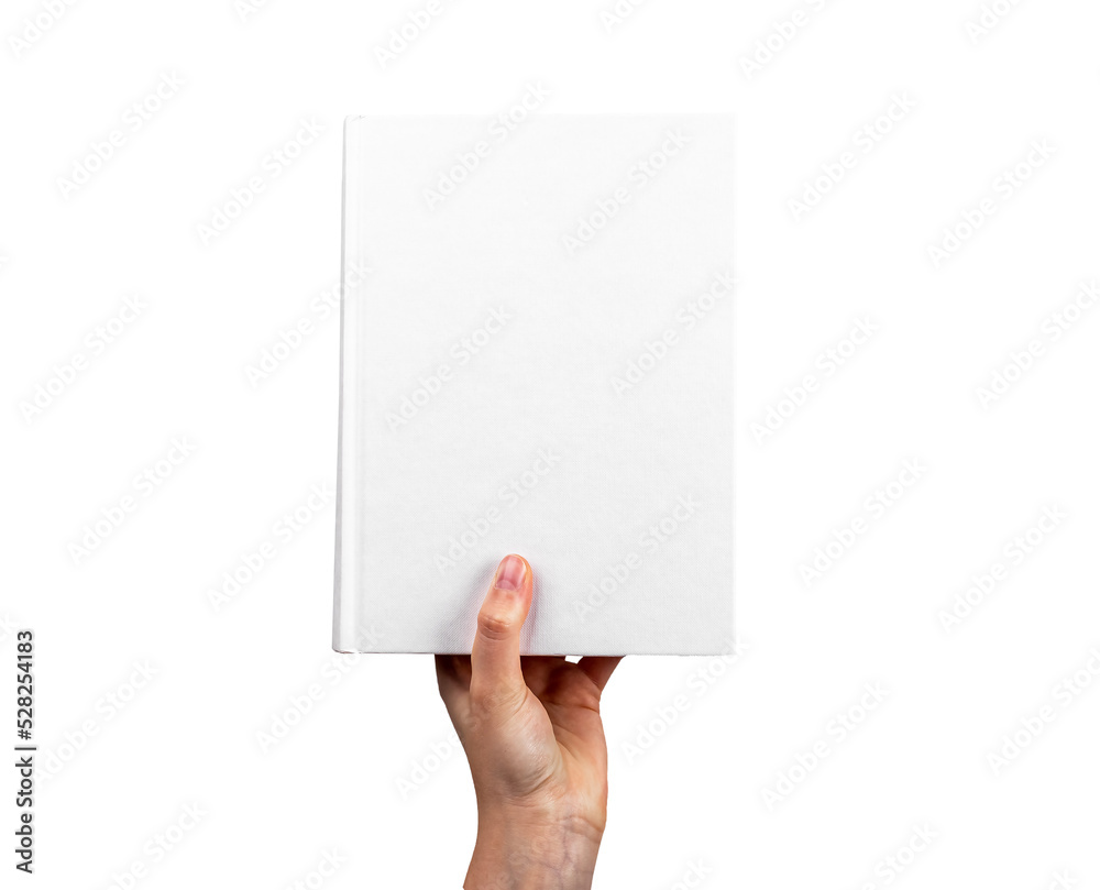 Hand holding closed book mockup isolated on white background. Novel, encyclopedia, code, Bible template with blank cover. Reading leisure, study, learning concept