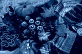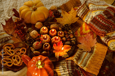 pumpkin, candles, pretzels, nuts, leaves, apple, knitted sweaters and socks on table close up. autumn background. fall season, thanksgiving, harvest, Halloween concept. top view