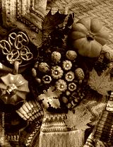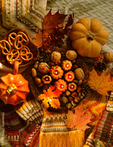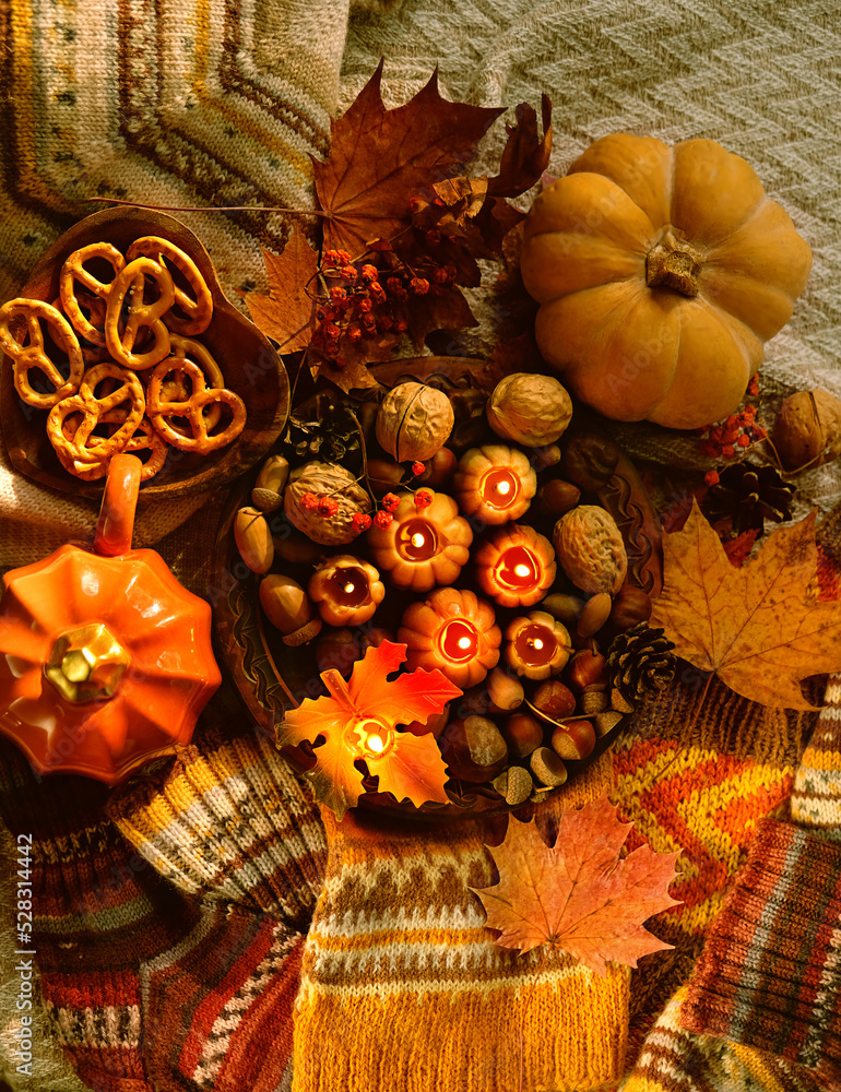 pumpkin, candles, pretzels, nuts, leaves, apple, knitted sweaters and socks on table close up. autumn background. fall season, thanksgiving, harvest, Halloween concept. top view