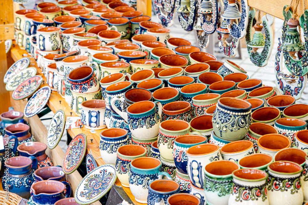 Traditional Romanian handmade ceramics market at the potters fair from Sibiu, Romania