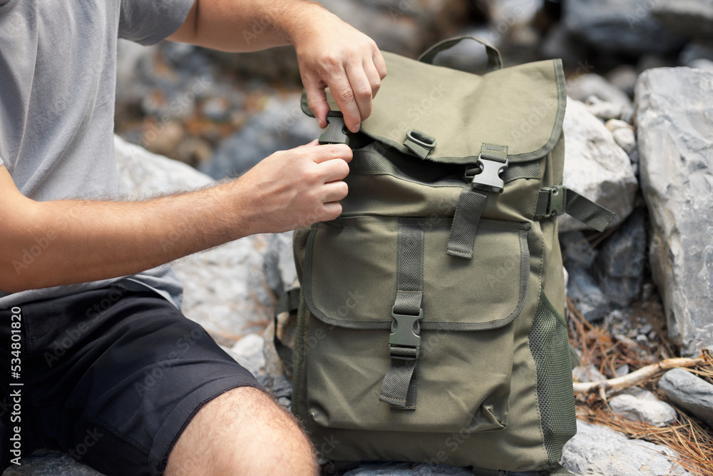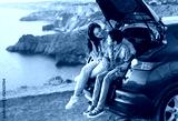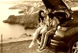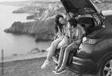Family trip to the mountains by car. Mom is having fun with her teenage son, sitting in the trunk of a car and enjoying the view together