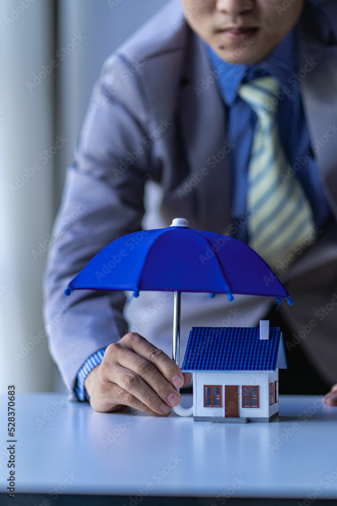 a businessman spreading a blue umbrella for the house Real estate, insurance and property concepts