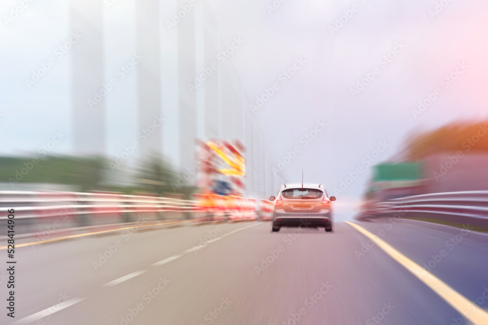 Freeway and a lone car driving next to attention signs and closed lane for repairs and maintenance.