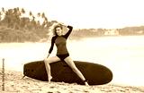 Beautiful slim athletic girl with a surfboard on the beach of the Indian Ocean. Sri Lanka