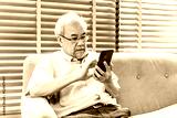 Pleasant senior older man resting on couch at home, older middle aged male customer holding smartphone using mobile app, texting message, search ecommerce offers on cell phone technology device