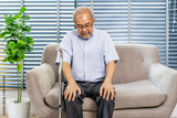 Pensive senior man leaning on walking stick while sitting on sofa. Lonely elderly man sitting in living room at home. lost in sad thoughts feels lonely, recollect life moments